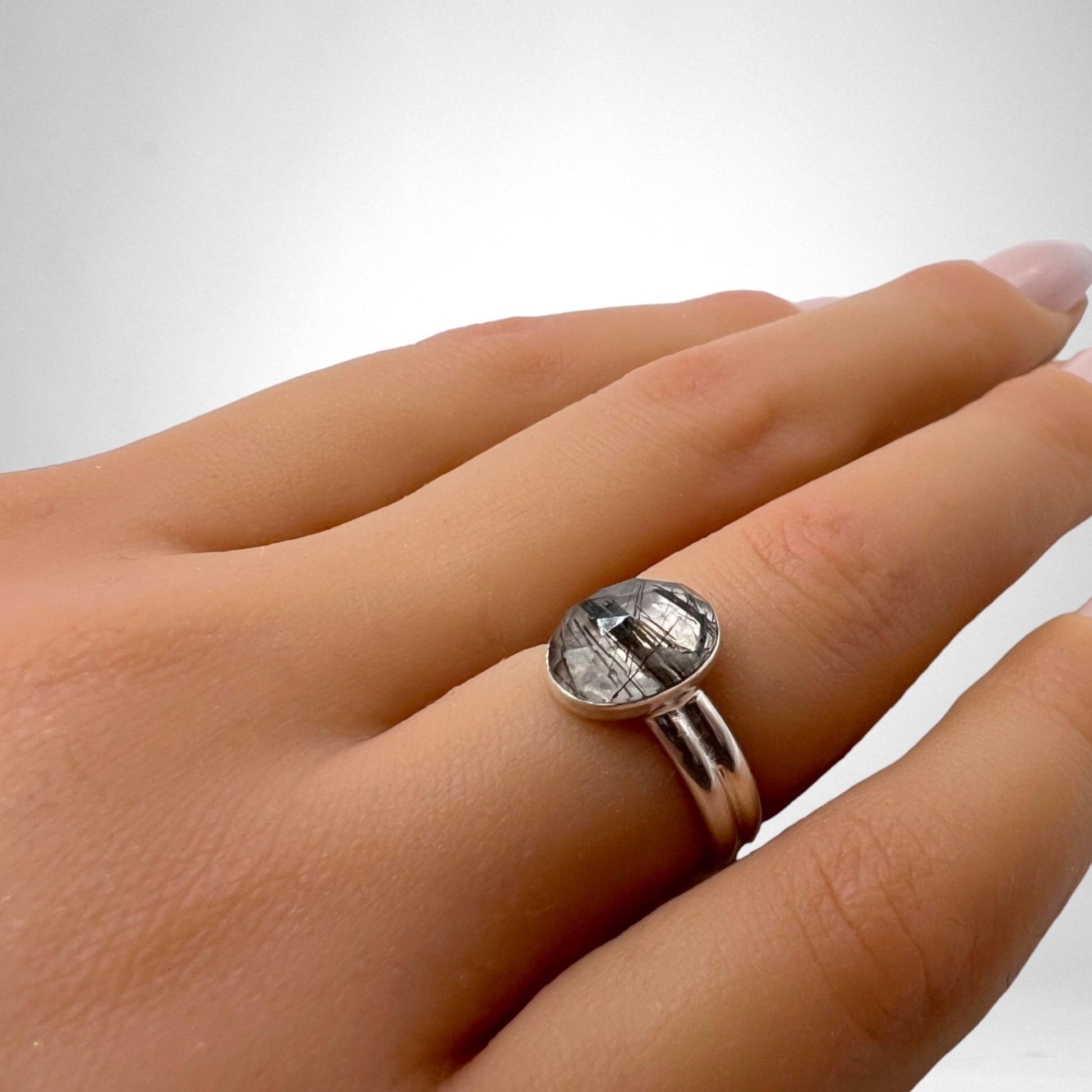 Handsmíðaður 925 Sterling silfurhringur með fallegum tvöfuldum vír og náttúrulegum 8x10mm Black Rutile steini.
