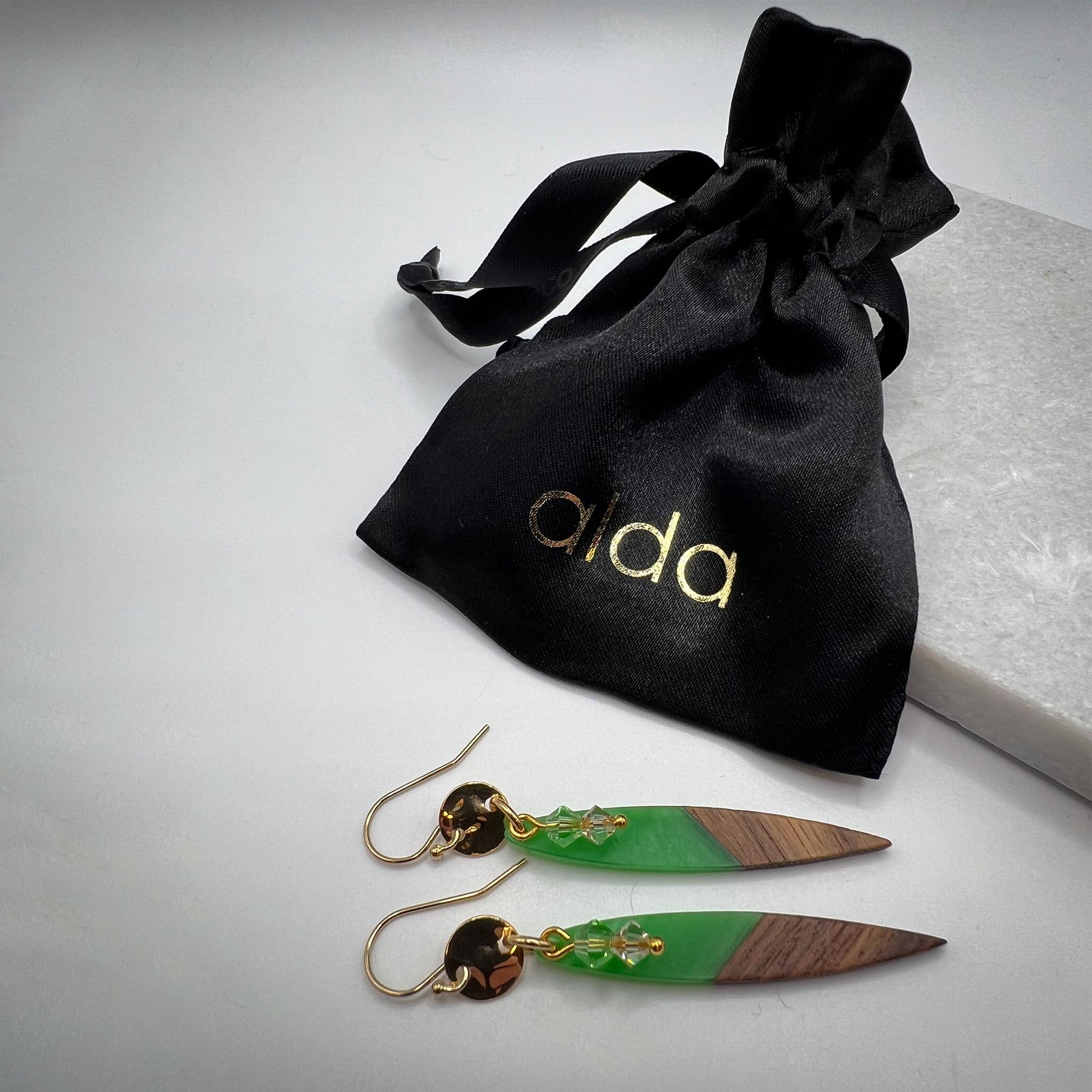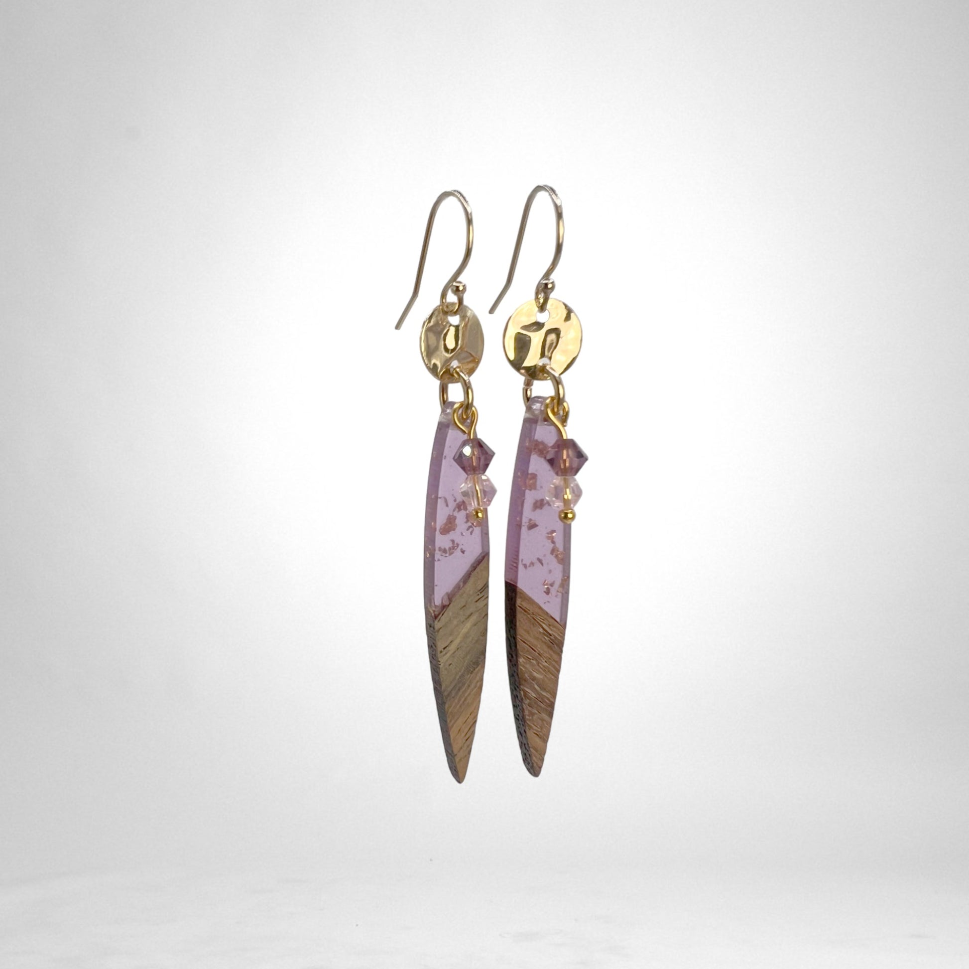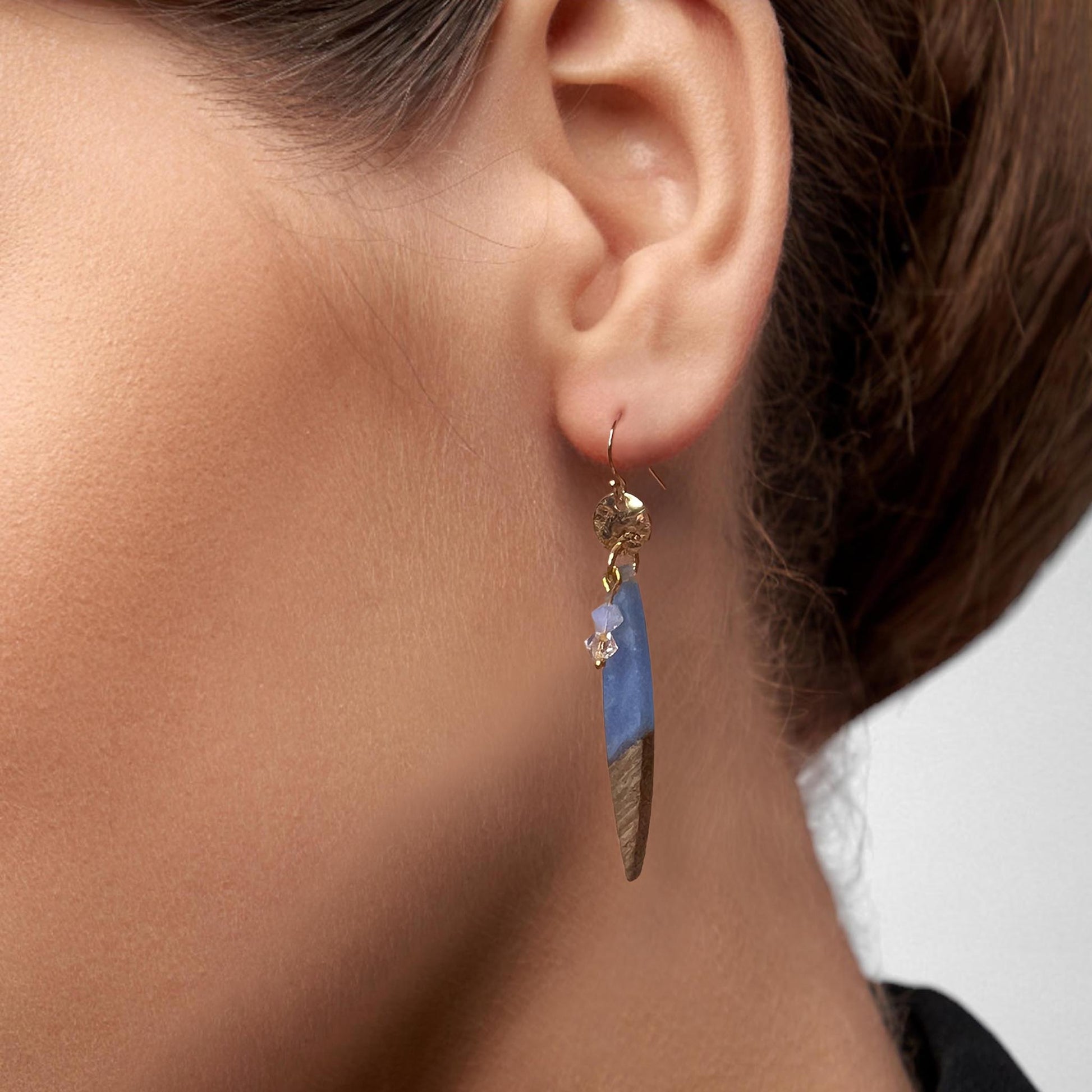 Handgerðir eyrnalokkar með litríku viðarskrauti og kristal. Lokkur í eyra og hringir er 14k gullfylltir, gullskífa er gulllituð.
