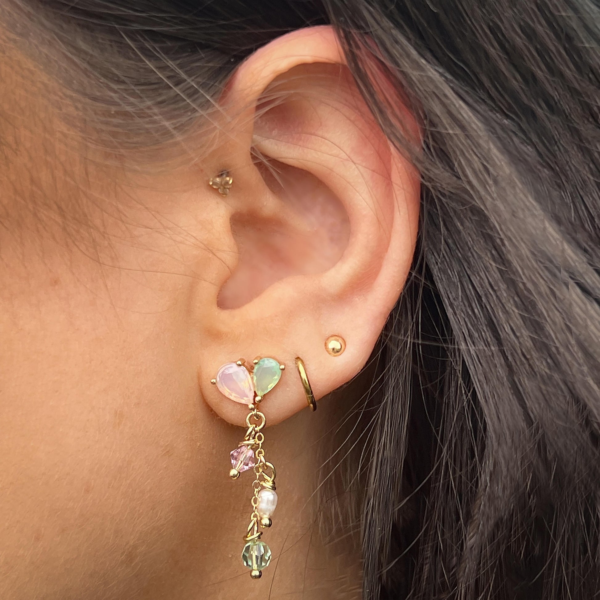 Handgerðir gull litaðir eyrnalokkar með kristal og smárri ferskvatnsperlu.