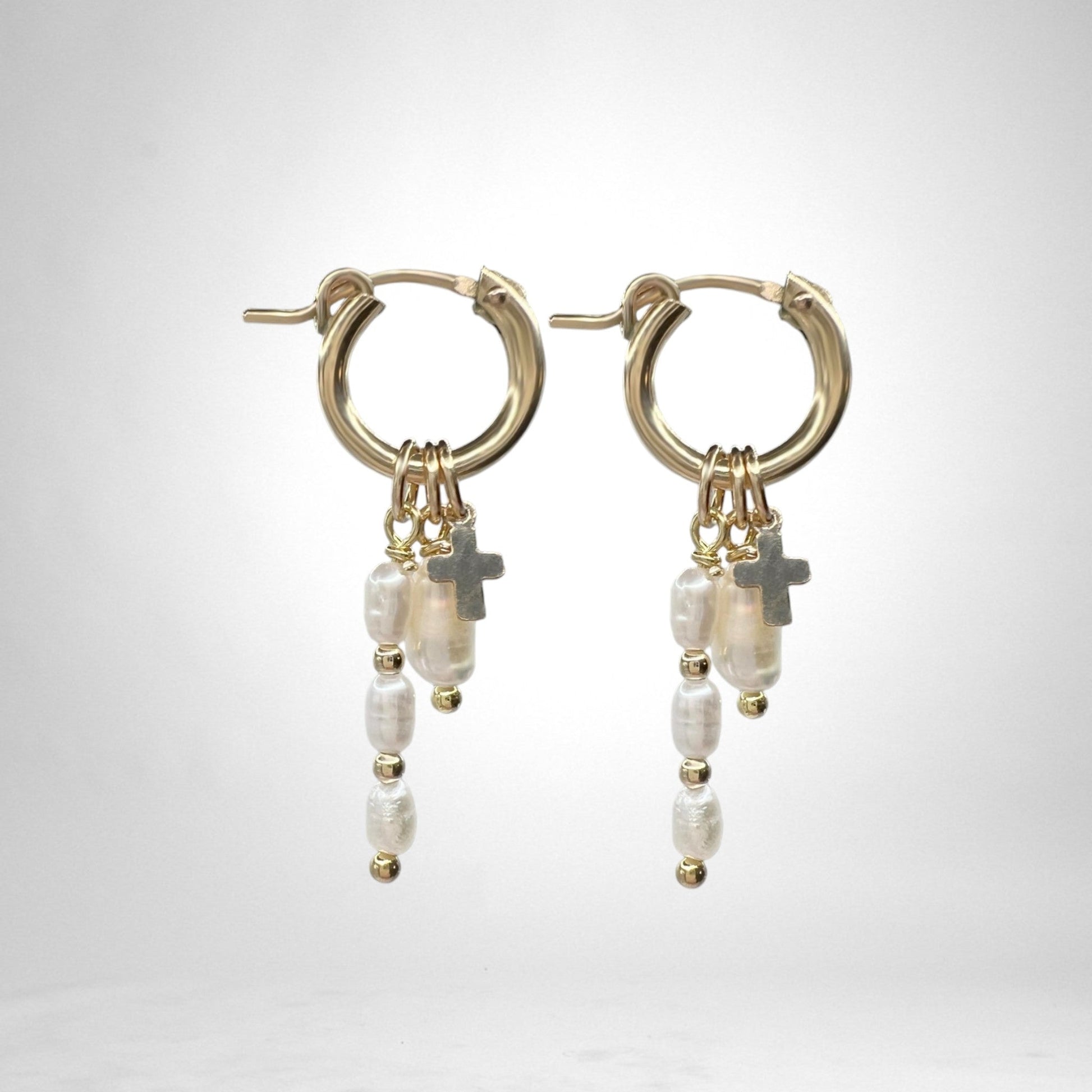 14k Gullfylltir Ø13mm hringlokkar með perlum og kross♡